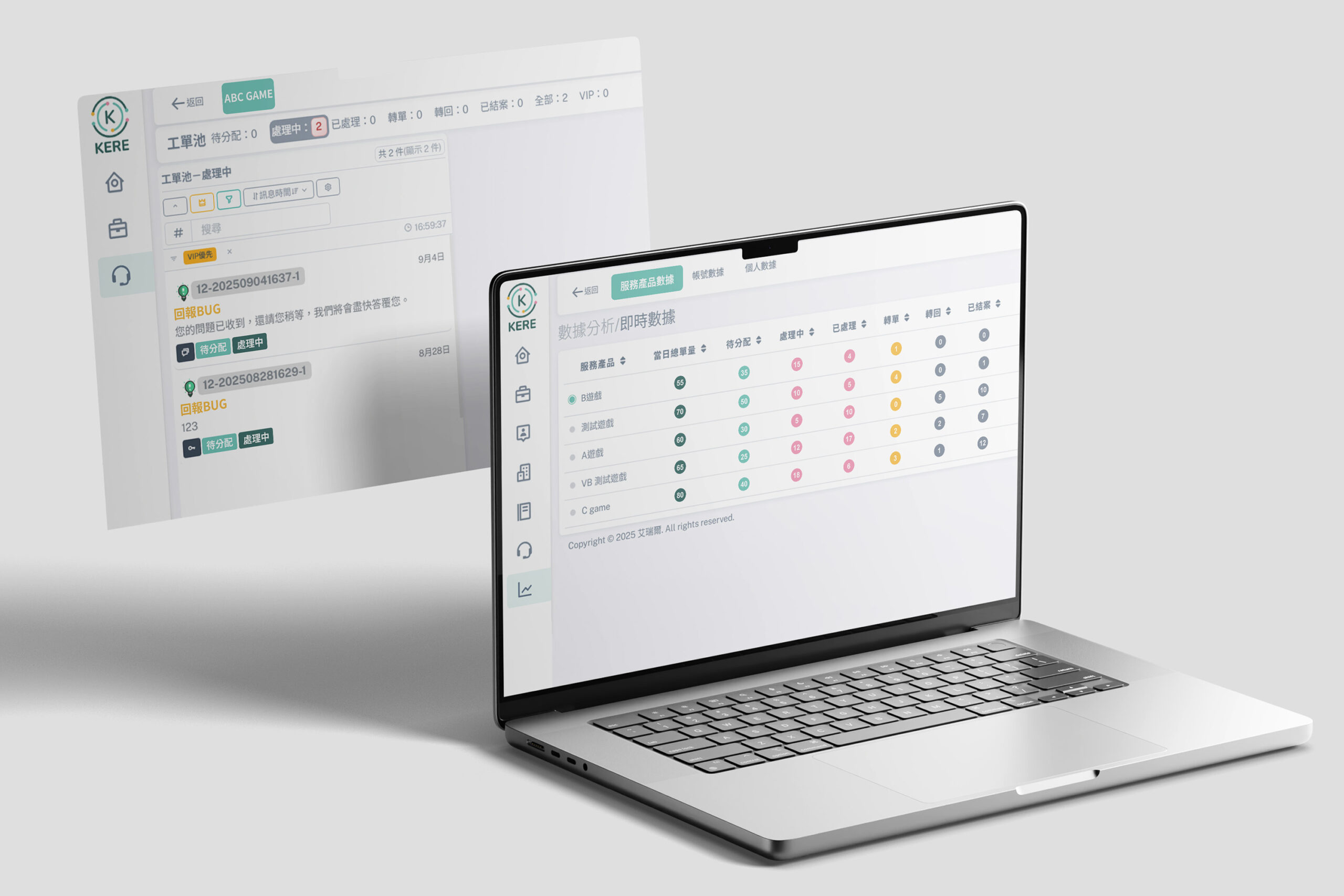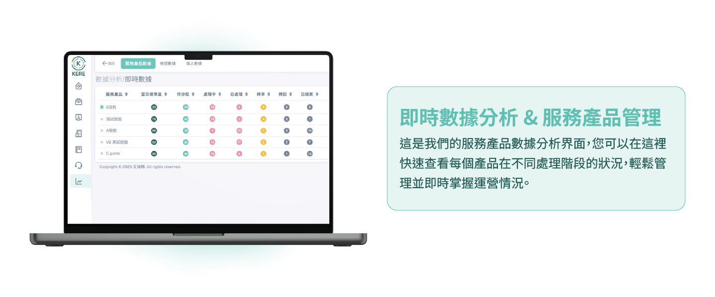 AI智能客服 結合 AI 智能分析 與 專業客服經驗,Ariel 專為遊戲產業打造高效率的全方位客服解決方案。 透過自動化問答、智慧分類派單與即時回應機制,協助遊戲公司快速處理大量玩家需求,全面提升客服效率與玩家滿意度。 無論是一般諮詢、技術支援,或是複雜的案件追蹤,系統皆能依據問題屬性,自動指派最合適的專員處理,並完整記錄每一步服務流程,確保後續追蹤與分析更精準。 後台即時報表讓管理者清楚掌握運作狀況,協助團隊持續優化服務品質與營運策略。 讓您的客服團隊 事半功倍,讓玩家 感受最即時、最貼心的互動體驗。 與 Ariel AI 客服工單系統 一起,邁向智能客服的新時代。 即時掌握服務產品數據 即時呈現各項服務與產品的運作狀況,從客服量能、使用頻率到滿意度變化,一目了然。透過直覺化的儀表板,管理者能迅速洞察趨勢、預測問題並即時調整策略,讓營運決策更精準、更高效。 即時回應玩家問題整合多渠道訊息來源,AI 自動分類與優先排序,確保每個玩家的問題都能即時回覆。客服人員可即時追蹤案件狀態、交接記錄與回覆品質,打造更流暢的支援體驗,全面提升玩家滿意度與品牌信任感。
